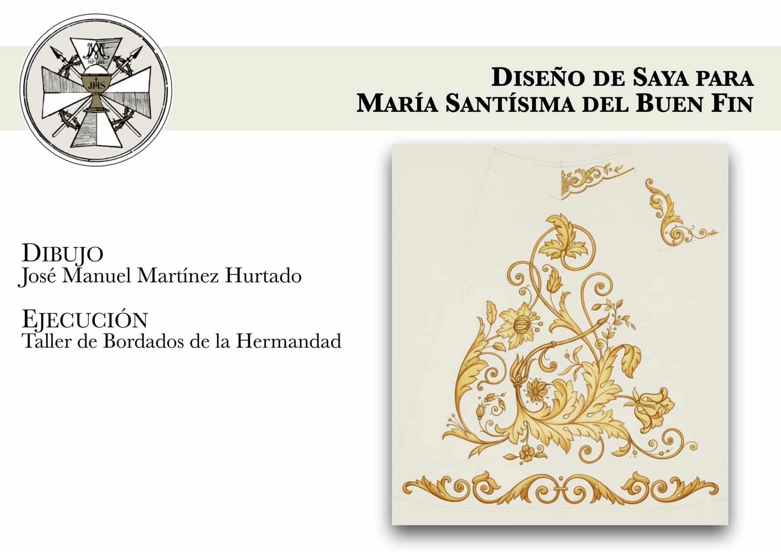 Nueva saya para la Virgen: Se ha presentado el diseño para una nueva saya de María Santísima del Buen Fin, que será ejecutada por el Taller de Bordados de la Hermandad, dirigido por D. Manuel Chacón. El diseño de la saya, de corte asimétrico, está realizado en estilo decimonónico vegetal.